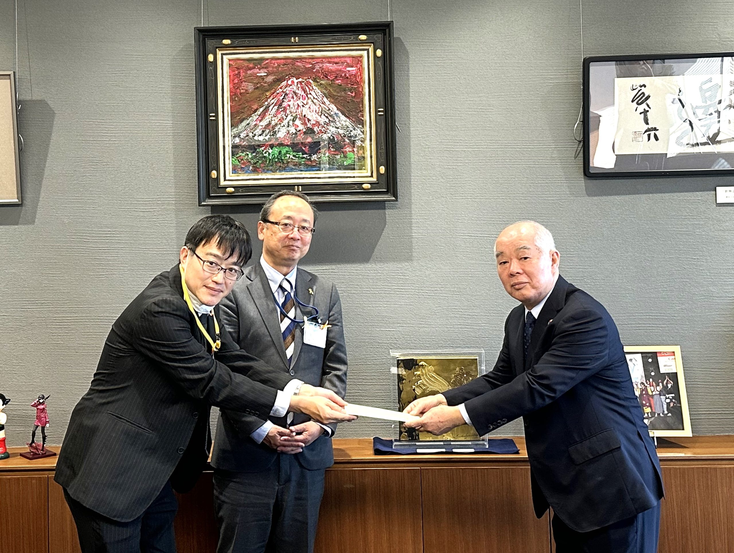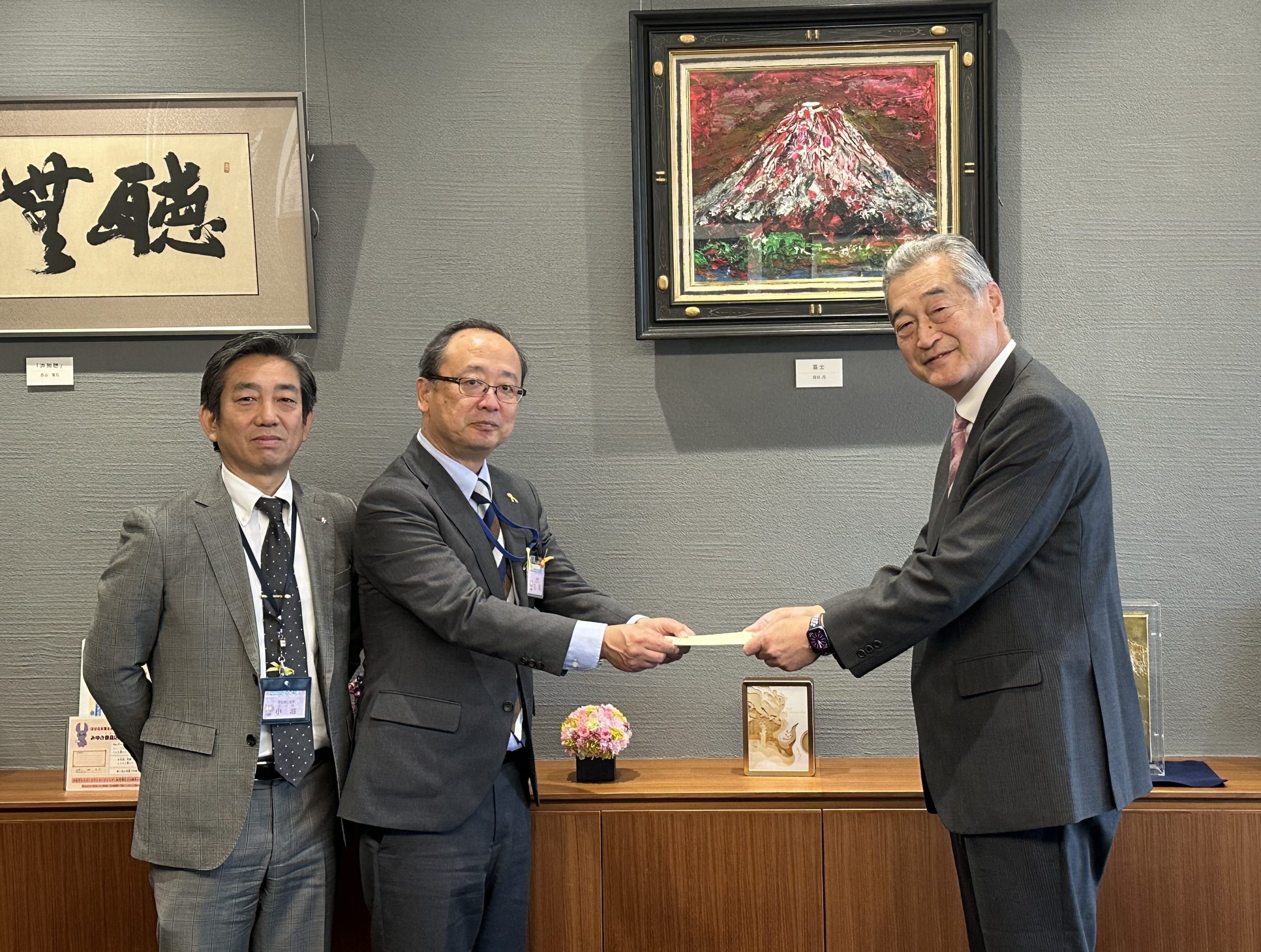 12/8、天貝氏(豊島区副区長)・小池氏(豊島区文化商工部長)、竹川氏(豊島区民社会福祉協議会企画経営担当課長)へ該当額を手渡しました。